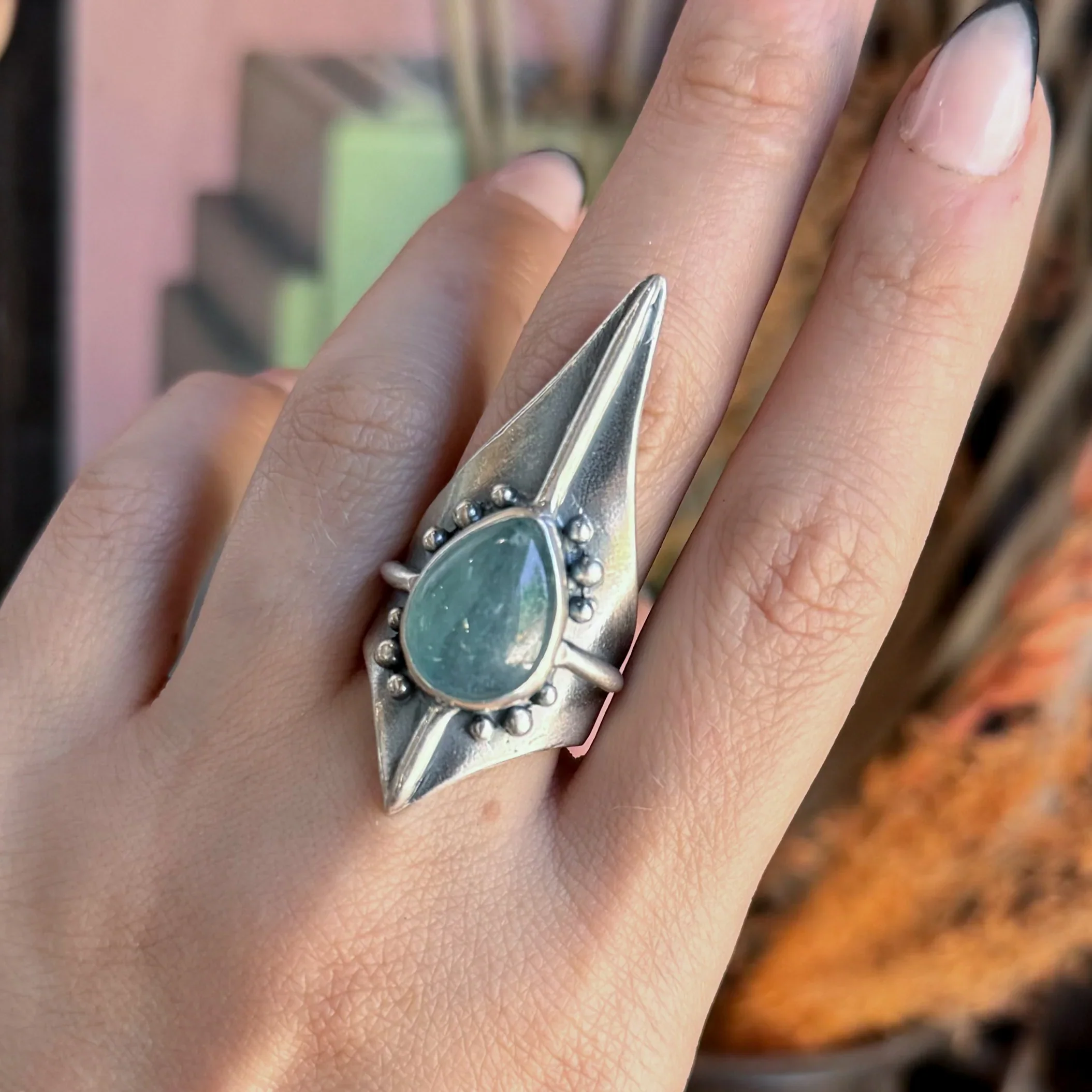 Sterling silver hand fabricated Shield ring set with a natural Aquamarine.If you have questions regarding fit, you can contact us at any time.