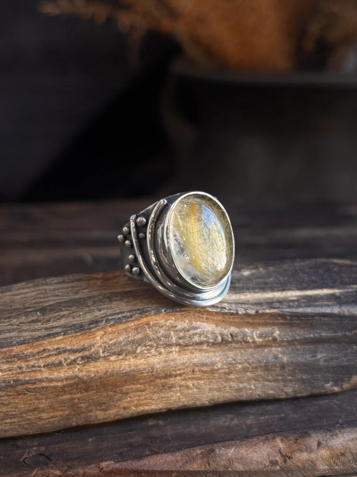 Sterling silver hand fabricated Eluned Warrior ring set with a natural Rutilated Quartz. If you have questions regarding fit, you can contact us at any time.