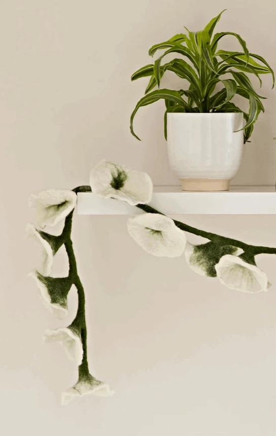 Colorful, sustainable and fair trade, felt flower garland is a beautiful way to add a touch of color and texture to your home. They can be used as a natural element for a mantle, wrapped around stair railings, lamps, or even draped around windows and chandeliers. We use them all over Nocturne for an added touch of whimsy. These felt flowers are handmade by skilled artisans at a woman's cooperative in Nepal whom work in a fair trade and healthy environment to design and create these beautiful and unique pieces.