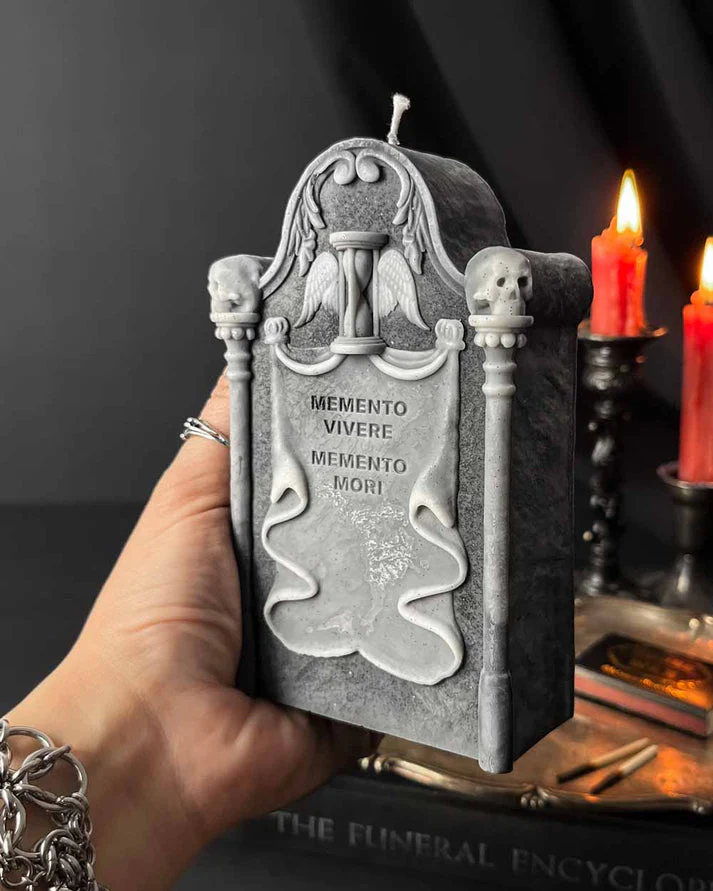The Memento Mori Candle by Graveyard Wanders is a powerful reminder that life is fleeting. Its design features an hourglass with wings, symbolizing the passing of time, and skulls displayed on pedestals, representing the inevitability of death. The scent, Beloved Bones, reflects our truest and most vulnerable selves. This original design from Graveyard Wanders adds a unique and personal touch to each tombstone, carefully hand-poured for a special experience.