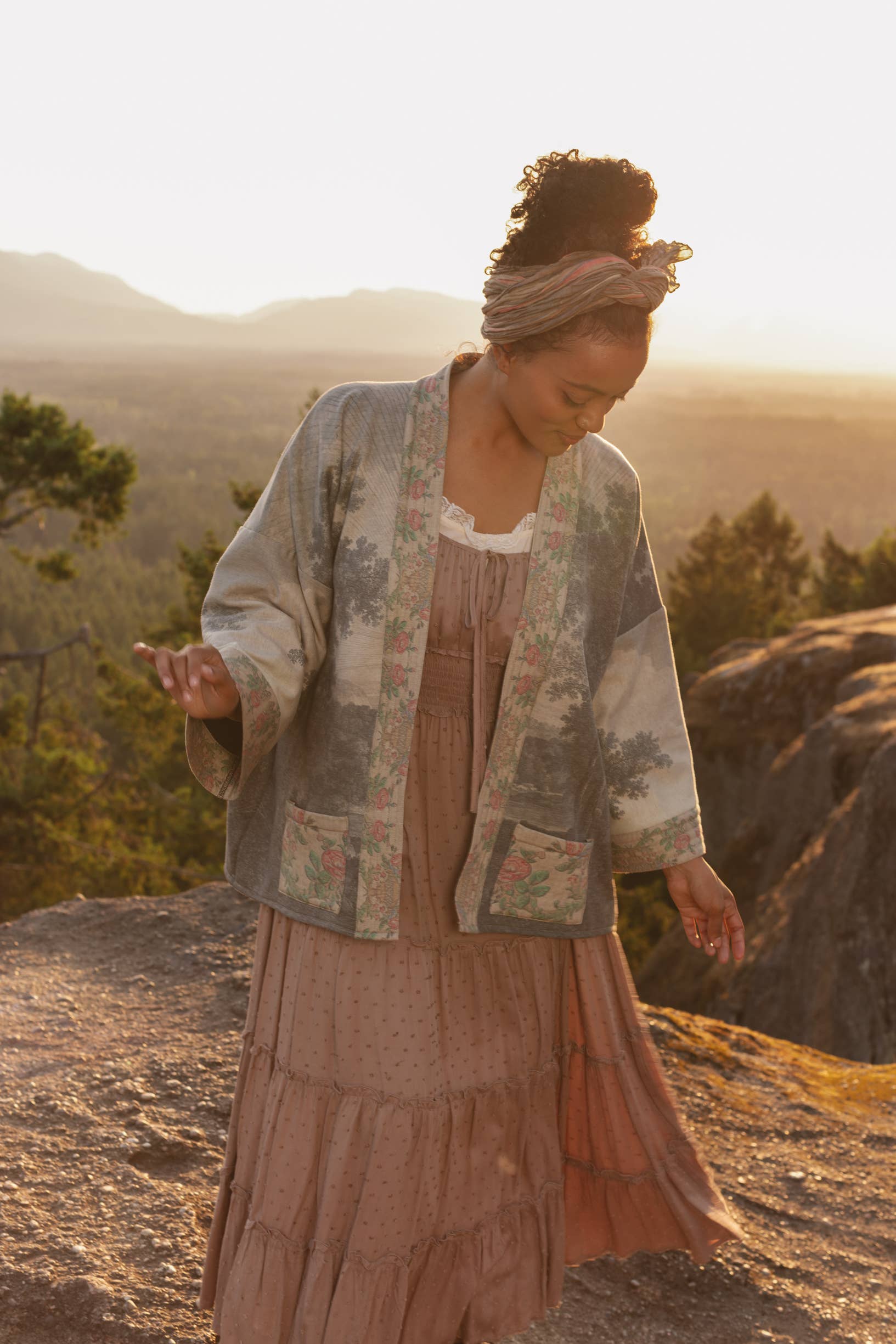 Crafted from cozy printed cotton & spandex lined with super soft poly-fleece, our Cottage Jackets combine the warmth and comfort of a cardigan with the style, versatility, and look of our stardusters. Dreamy, romantic, and full of hope — Still I Rise was created for those who meet each day with a loving and tenacious heart, come what may. We layered together several historic engravings from the 18th century to make this piece and married them with the captivating image of a woman boldly greeting the sun. There’s something so strong in her posture, and we love that she’s stepping forward to meet the day in her bare feet with joy! The trim comes from an intricate watercolour-and-ink drawing of an American heritage quilt from the 1930’s. Cardigan measurements: length approximately 65cm, width (across back, underarm to underarm) approximately 74cm. Model is 5’2”.