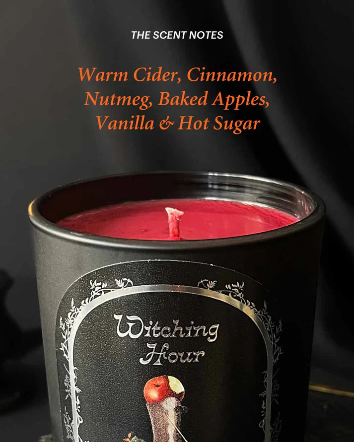 This candle burns for 55 hours. Your eyes widen as the clock strikes midnight on Halloween. With a witch hat on your head and a broom in hand, you're spellbound.