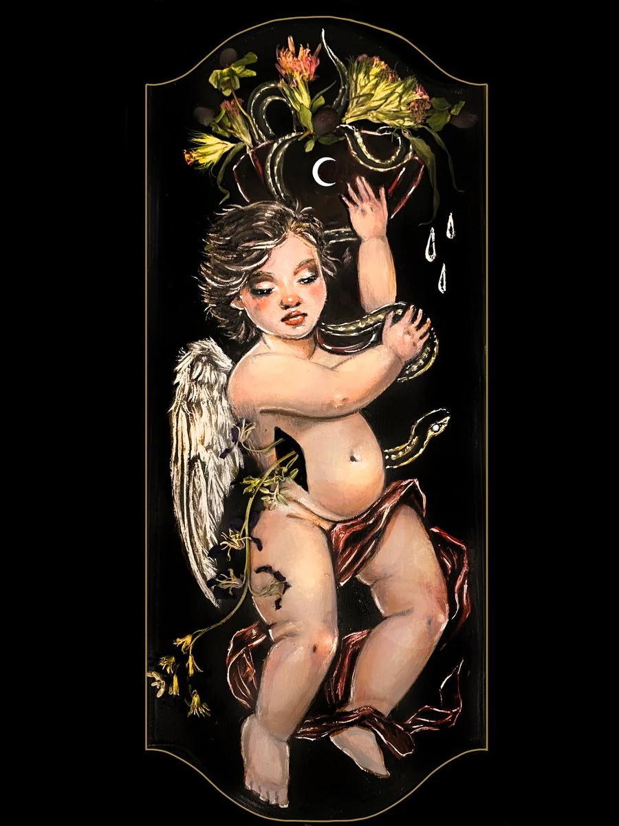 Her inspirations are nature, New England's haunted lore, as well as biblical imagery and Dutch vanitas paintings. Her craft bends the real and surreal; a dreary but enchanting showcase of mortality using dried, dead flowers against rendered oil paintings.